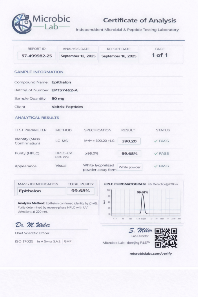Veltrix Peptides focuses on delivering high-purity Epithalon peptides, verified through advanced laboratory testing methods such as HPLC analysis and mass spectrometry.